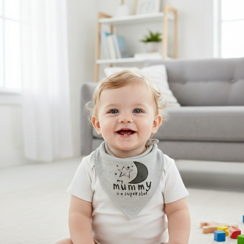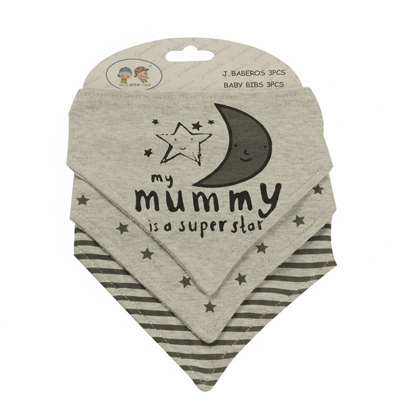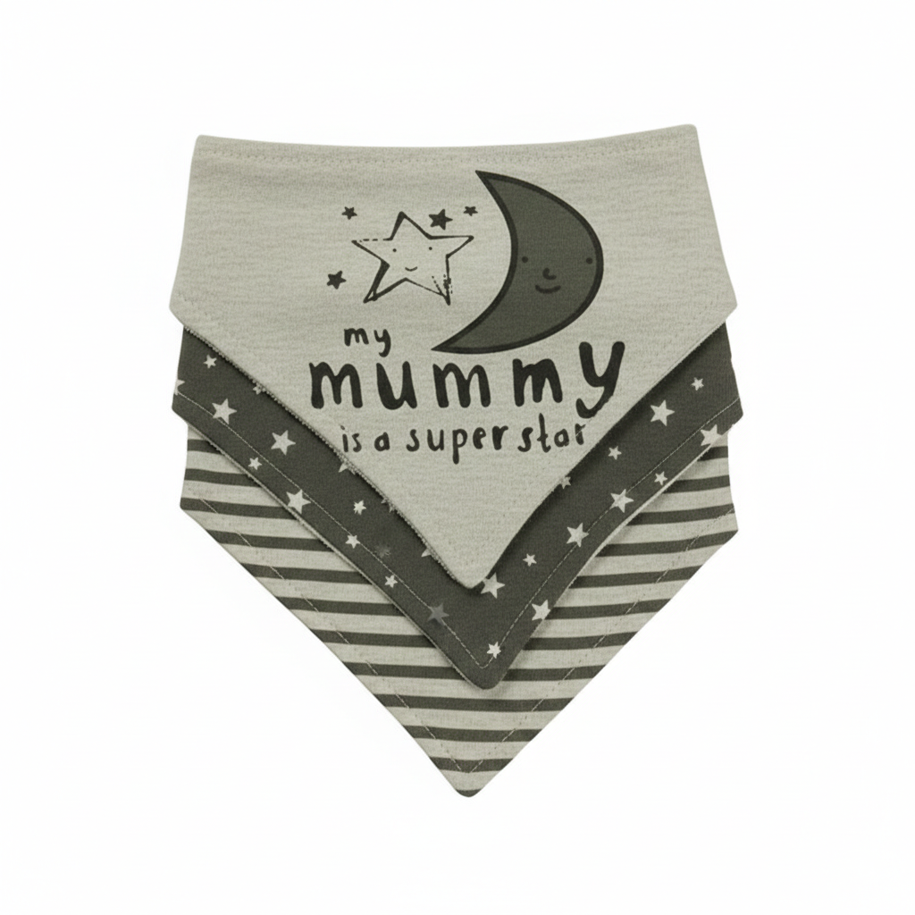 Η συσκευασία περιλαμβάνει ένα πρακτικό σετ τριών τεμαχίων με διαφορετικά σχέδια, ένα με το γλυκό μήνυμα "My Mummy is a Superstar", ένα με αστεράκια και ένα κλασικό ριγέ ώστε να έχετε πάντα μια καθαρή και στυλάτη επιλογή στη διάθεσή σας. Πρόκειται για μια ποιοτική κατασκευή υψηλής αντοχής, που παραμένει απαλή και διατηρεί το σχήμα της ακόμα και μετά από τα συχνά πλυσίματα που απαιτεί η καθημερινότητα με ένα βρέφος.